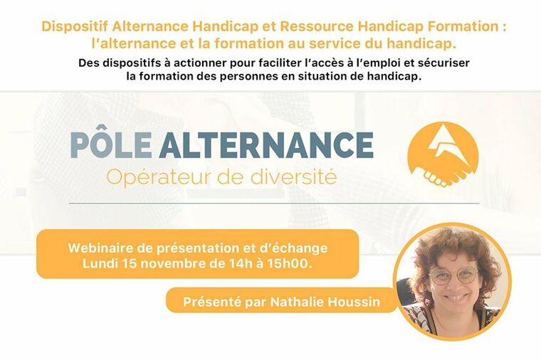 Replay du webinaire sur le Pôle Alternance réalisé le 15 novembre 2021, à l'occasion de la Semaine Européenne pour l’Emploi des Personnes Handicapées. Cette vidéo est présentée par Nathalie Houssin, coordinatrice du Pôle Alternance pour la Moselle.