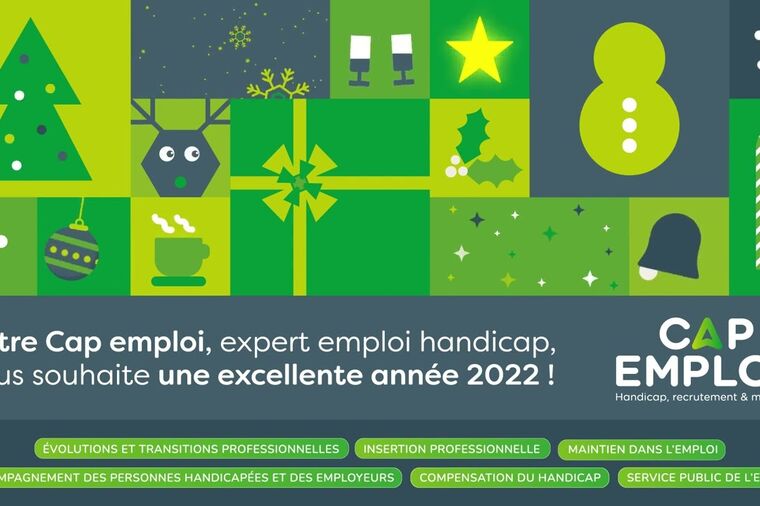 transcription : Vidéo présentant la carte de voeux 2022 Cap emploi Texte de la carte : "Votre Cap emploi, expert emploi et handicap, vous souhaite une excellente année 2022. Cap emploi. évolutions et transitions professionnelles. Insertion professionnelle. Maintien dans l'emploi. Accompagnement des personnes handicapées et des employeurs. Compensation du handicap. Service Public de l'emploi"